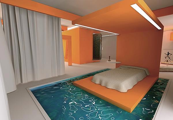 Ma avere una casa con piscina ormai è sorpassato e soprattutto scomodo per la notte: se si vuole fare un bagno rinfrescante bisogna alzarsi e uscire. Allora perché non costruire una piscina direttamente nella propria camera da letto? Se ci si sveglia per il caldo basta un tuffo per rinfrescarsi e poi… si può tornare subito a dormire.