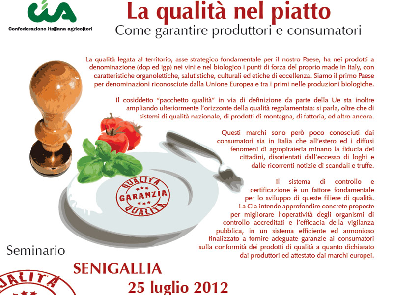 Si terrà presso la Rotonda a Mare di Senigallia, nelle Marche, il Seminario organizzato dalla CIA – Confederazione Agricoltori Italiani – “La qualità nel piatto, come garantire produttori e consumatori”.