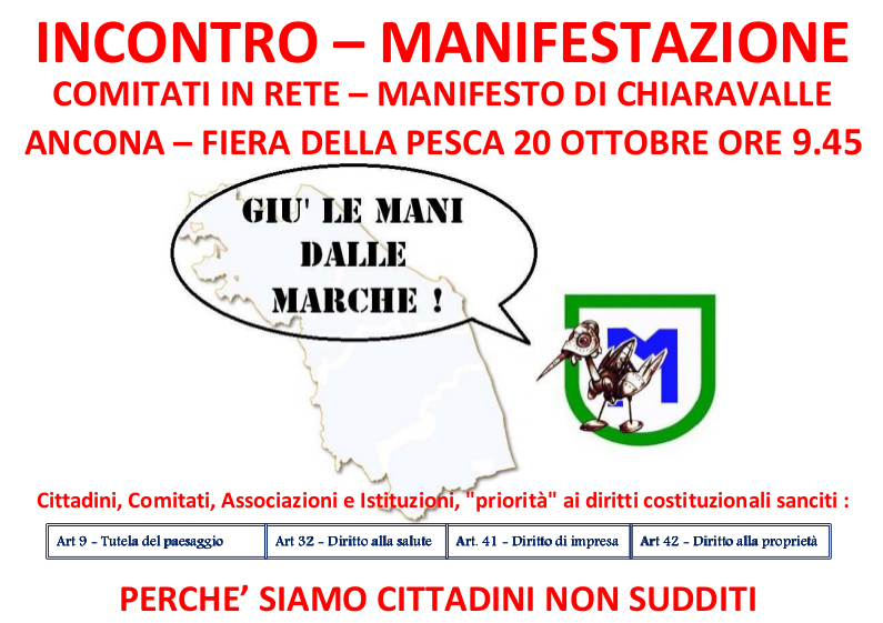 Nuova iniziativa di protesta dei comitati marchigiani per la tutela del territorio. Sabato 20 ottobre, alle ore 9,45, si terrà un incontro con manifestazione alla fiera della pesca di Ancona, dal titolo: “Giù le mani dalle Marche!”.