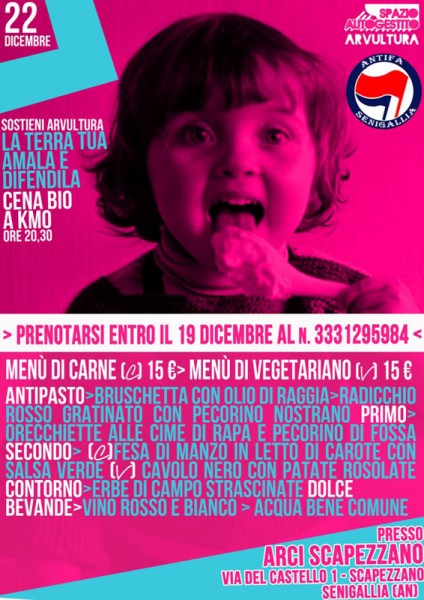 Una cena per autofinanziare un progetto, un’idea, quella dello Spazio Comune Autogestito Arvultùra. Una cena alla quale parteciperanno 150 persone. Una bella risposta solidale, dopo la macchina del fango di questi giorni. Questa volta però, non si tratta solo di noi: infatti, d’ora in poi, abbiamo deciso di caratterizzare le nostre cene sociali e di autofinanziamento con prodotti locali e biologici, come da quasi un anno, facciamo con gli aperitivi durante le iniziative estive. Il biologico e il Km 0 rappresentano per noi una pratica politica.