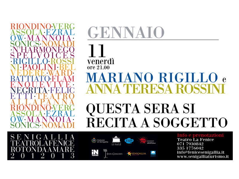 Venerdì 11 gennaio il cartellone del Teatro La Fenice di Senigallia, promosso dal Comune in collaborazione con AMAT e Inteatro, apre il nuovo anno con un classico della scena italiana, “Questa sera si recita a soggetto” di Luigi Pirandello con protagonisti Mariano Rigillo e l’attrice senigalliese Anna Teresa Rossini per la regia di Ferdinando Ceriani.