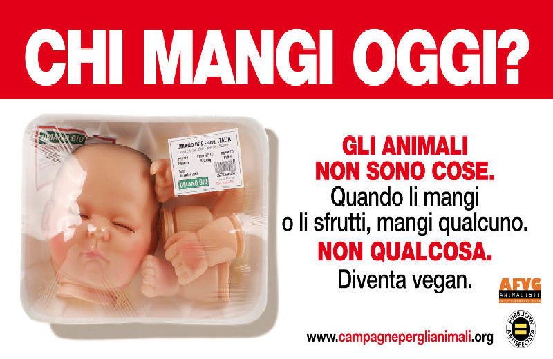 Nell’immagine, uno spot pubblicitario di un’associazione vegana – quindi contraria a qualsiasi forma di consumo di prodotti animali – si vedono il viso ed altri pezzi del corpo di un bambino (nella realtà chiaramente una bambola), in una confezione sottovuoto; al fianco dell’immagine che sta suscitando molte polemiche in città una scritta: “Chi mangi oggi? Gli animali non sono cose. Quando li mangi o li sfrutti, mangi qualcuno. Non qualcosa. Diventa vegan”.