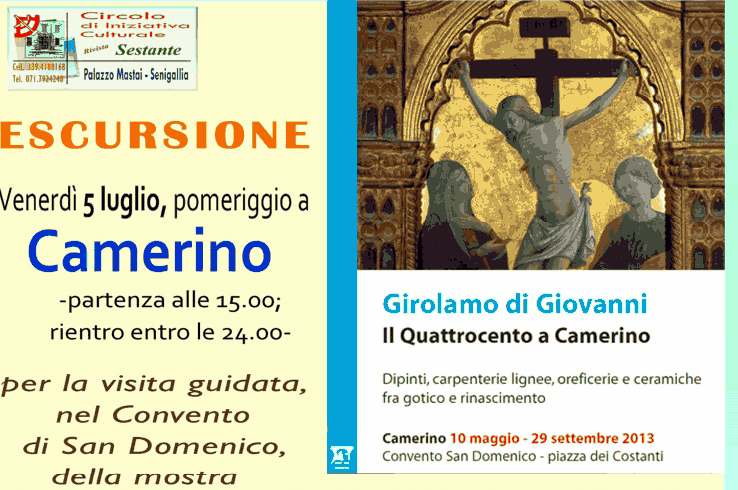 Il pomeriggio del 5 luglio, venerdì, il Circolo di Iniziativa Culturale e la rivista “Sestante” propongono un suggestivo ritorno a Camerino per la visita guidata della mostra“Girolamo di Giovanni. Il Quattrocento a Camerino. Dipinti, carpenterie lignee, oreficerie e ceramiche fra Gotico e Rinascimento”.L’esposizione è allestita nei locali della pinacoteca nel complesso museale di San Domenico ed ha preso spunto dal ricongiungimento delle due cuspidi con figure di Evangelisti rinvenute nel mercato antiquario, con la Crocifissione giunta alla Galleria delle Marche dalla chiesa di Monte San Martino.