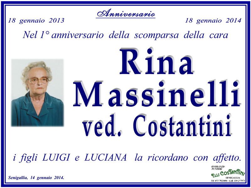 Cade il 18 gennaio 2014 il 1° anniversario della scomparsa della cara Rina Massinelli, ved. Costantini.
