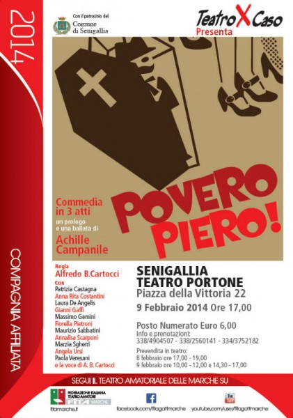 Al Teatro Portone domenica 9 febbraio, alle 21, va in scena “Povero Piero!”, commedia in tre atti di Achille Campanile. Con il patrocinio del Comune di Senigallia, la compagnia di teatro amatoriale “Teatro Per Caso” si cimenterà in un prologo ed una ballata con la regia curata da Alfredo B. Cartocci.