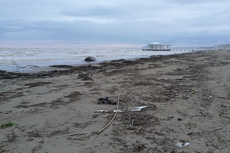A quei cumuli, che in molte zone – sia sul lungomare di ponente che di levante – diventano vere e proprie montagne, si sono aggiunte nella nottata altri detriti che hanno fatto ripiombare la spiaggia sotto uno strato di rametti e rifiuti, come si può vedere nelle foto scattate nella mattinata del 26 febbraio.