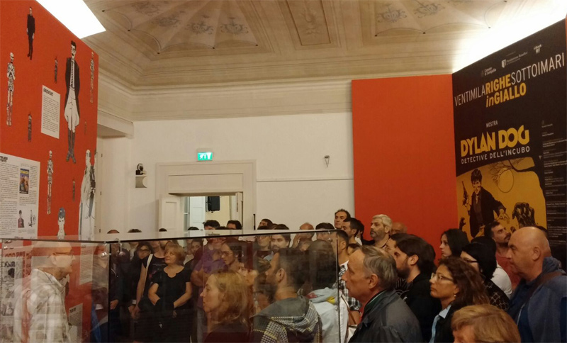 La gente in piedi lungo le scale di Palazzo del Duca con la fila che arriva fino alla Piazza. Non è il pubblico accorso per un concerto rock ma è invece il popolo dei Dylaniani, gli appassionati di Dylan Dog che non si sono voluti perdere le visite guidate alla mostra di Senigallia organizzata dal Comune e dalla Fondazione Rosellini condotte dagli sceneggiatori e disegnatori del popolare fumetto di Bonelli.