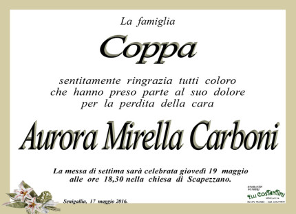 La famiglia Coppa sentitamente ringrazia tutti coloro che hanno preso parte al suo dolore per la perdita della cara Aurora Mirella Carboni.