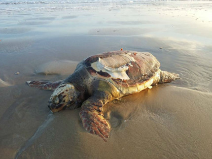 Nella foto, tratta da Facebook, la carcassa della tartaruga rinvenuta sul litorale di ponente. Nelle settimane precedenti, sempre sulla spiaggia di Senigallia, erano stati rinvenuti i corpi senza vita di due delfini della specie Tursiope, al Ciarnin e a Marzocca.