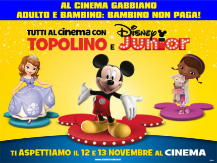 Sabato 12 novembre alle ore 18:30 e domenica 13 novembre alle ore 15:00 e 16:40, al Cinema Gabbiano tutti al cinema con Topolino! Iniziativa sperimentale in cui il bambino accompagnato da un adulto entrerà gratis alla visione dei tre episodi marchiati Disney.