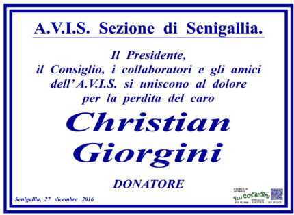 Manifesto di cordoglio della sezione di Senigallia dell'AVIS per la scomparsa di Christian Giorgini