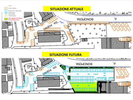 1. tutti i parcheggi diventeranno a pagamento (forse anche i 78 stalli per le moto visto che sono disegnati in azzurro) anche quelli di fronte agli esercizi commerciali di viale Bonòpera e di via Poerio;