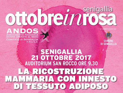 Sabato 21 ottobre, a Senigallia, nell’ambito di “Ottobreinrosa”, presso l’Auditorium San Rocco, con inizio alle ore 9.30, l’A.N.D.O.S. (Associazione Nazionale Donne Operate al Seno) – Comitato di Senigallia, in collaborazione con il Comune di Senigallia, ha organizzato un incontro, aperto a tutta la cittadinanza, sul tema “La ricostruzione mammaria con innesto di tessuto adiposo”.