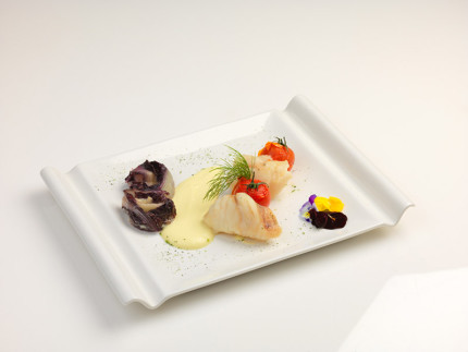 Bocconcini di rana pescatrice in olio cottura con spuma di patate alla menta e radicchio brasato