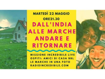 La Onlus Amici di Casa BBL ospite a Radio Incredibile per raccontare i progetti sostenuti in India. La puntata speciale, dal titolo “Dall’India alle Marche, Andare e Ritornare- Missione Incredibile”, sarà on Air martedì 22 maggio dalle 21.30 sul sito www.radioincredibile.com.