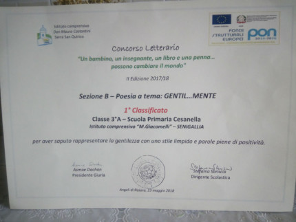 Con la poesia “La gentilezza” per il concorso letterario, II edizione 2017/2018 “Un insegnante, un alunno, un libro, una penna…possono cambiare il mondo”, promosso dall’Istituto comprensivo statale “Don Mauro Costantini” di Serra San Quirico ed esteso a tutta la regione Marche, la classe 3^ della scuola primaria Cesanella, I.C. Mario Giacomelli (Insegnante referente Loviento Immacolata) ha vinto il 1° Premio per la Sezione B-Poesia a Tema “Gentil…mente”.