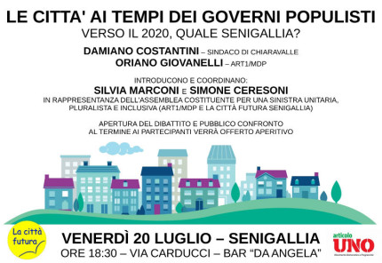 Venerdì 20 luglio alle ore 18.30 presso il Bar Angela, in via Carducci, si svolgerà l’incontro pubblico, organizzato dall’Assemblea costituente per un soggetto di sinistra unitaria, pluralista e inclusiva per Senigallia (promossa da Art 1 MDP e La Città Futura).