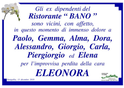 Gli ex dipendenti del ristorante “Bano”, sono vicini, con affetto, in questo momento di immenso dolore a Paolo, Gemma, Alma, Dora, Alessandro, Giorgio, Carla, Piergiorgio ed Elena per l’improvvisa perdita della cara Eleonora.