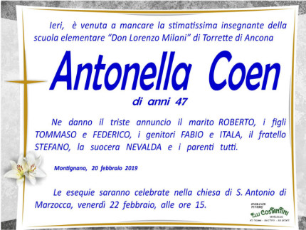 Ieri è venuta a mancare la stimatissima insegnante della scuola elementare Don Lorenzo Milani di Torrette di Ancona, Antonella Coen, di anni 47.