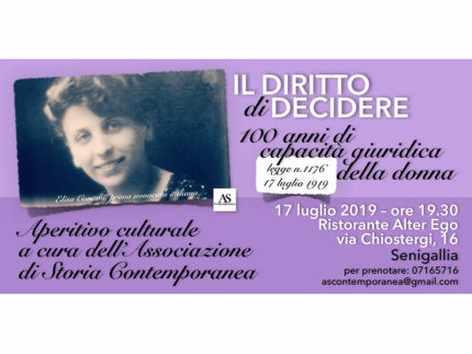 Parte martedì 16 luglio da Senigallia una settimana di iniziative dedicate alle donne, in occasione del primo centenario della legge n. 1176, 17 luglio 1919 che ha riconosciuto la capacità giuridica alla donna, annullando il datato istituto dell’autorizzazione maritale e aprendo alle italiane le porte del mondo del lavoro.