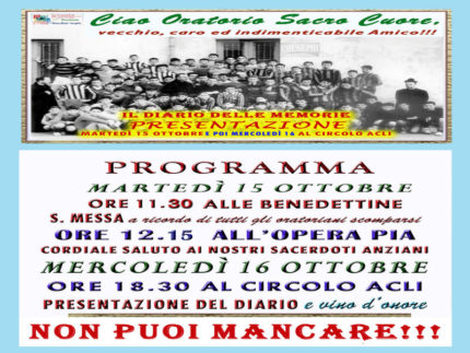 3- La proposta al pubblico al Circolo ACLI del fascicolo, in distribuzione gratuita col commento del sottoscritto e di qualche protagonista: mercoledì 16 alle ore 18,30. A seguire e per concludere il vino d’onore.