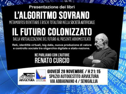 Lo Spazio Comune Autogestito Arvultura organizza per giovedì 28 novembre alle ore 21.15 la presentazione dei libri Renato editi da Sensibili alle foglie: “Il futuro colonizzato” e “L’algoritmo sovrano”.