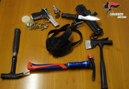 E’ stato quindi condotto all’ospedale di Ancona dove è stato sottoposto a TSO e ricoverato nel reparto di Psichiatria, in quanto sono stati riscontrati gravi disturbi psichici. All’interno dell’abitazione i militari hanno rinvenuto ben 31.500 euro in contanti, nascosti nell’armadio della camera da letto dall’uomo, 2 pistole a salve prive di tappo rosso, 31 cartucce a salve, un coltello da pesca modificato a pugnale di lunghezza pari a cm 28, due martelli da carpentiere e un’ascia, tutto sottoposto a sequestro. L’uomo è stato tratto in arresto per rapina e resistenza a pubblico ufficiale, ed il magistrato ha disposto l’immediata liberazione per motivi sanitari.