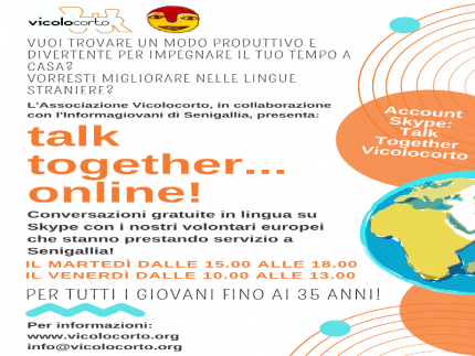 Ed è proprio per questo motivo che, dopo un periodo di pausa forzata, torna in veste on line “Talk Together” , il progetto organizzato dall’InformaGiovani del Comune di Senigallia e dall’associazione Vicolocorto per offrire a ragazze e ragazzi fino a 35 anni l’opportunità di migliore o approfondire la conoscenza di lingue come l’inglese, il francese, il tedesco e il polacco.