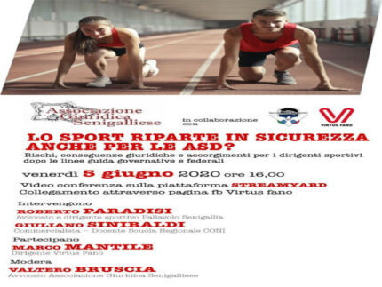 La videoconferenza, organizzata dall’Associazione Giuridica Senigalliese, in collaborazione, oltre che con l’Us anche con l’altra società pallavolistica della Virtus Fano, avrà un taglio giuridico prima ancora che sportivo, con accenni anche agli aspetti fiscali correlati.