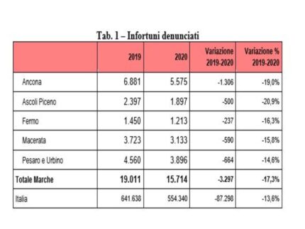 Secondo i dati annuali diffusi dall’INAIL ed elaborati dall’IRES CGIL Marche, nel 2020 nella regione sono stati denunciati 15.714 infortuni, 3.297 in meno rispetto al 2019 (-17,3%).