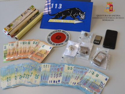 A fronte di tali informazioni, i poliziotti hanno deciso di fermare l’uomo mentre si aggirava sospettosamente in auto nella zona del lungomare Marconi di Senigallia. Apparso da subito agitato, gli agenti hanno approfondito i controlli presso la sua abitazione, all’interno della quale sono stati trovati diversi involucri contenenti hashish per un peso pari a circa 200 grammi e vari strumenti utilizzati per il confezionamento della droga destinata allo spaccio.