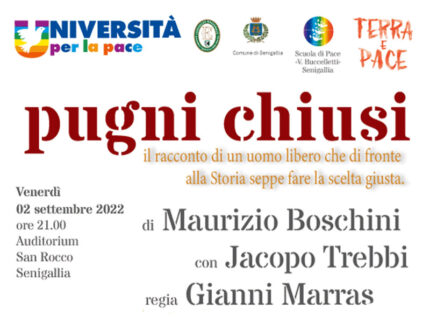 La tappa di Senigallia sarà il 2 settembre alle 21 presso l’auditorium San Rocco in piazza Garibaldi: qui potremo assistere allo spettacolo teatrale “Pugni chiusi” di Maurizio Boschini, con Jacopo Trebbi e la regia di Gianni Marras.
