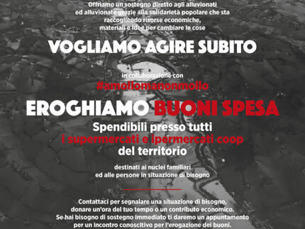 Da venerdì 21 ottobre in collaborazione con la campagna #amollomanonmollo inizieremo la distribuzione di buoni spesa alle persone e famiglie alluvionate in stato di grave necessità.