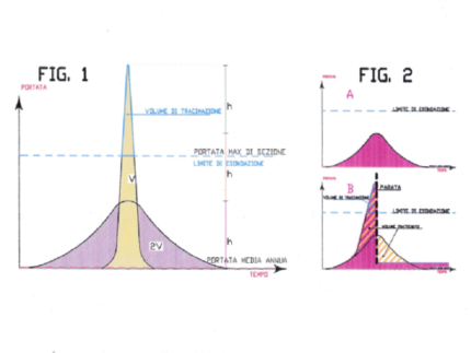 Esso, per una generica sezione fluviale, in un sistema di assi cartesiani con in ascissa il tempo e in ordinata la portata istantanea, rappresenta con l’area interna alle campane la massa d’acqua complessiva di una piena che transita e con la retta tratteggiata in celeste la portata istantanea max che la sezione é in grado di sopportare con le proprie sponde, con l’eventuale sormonto della campana che quantifica l’acqua destinata a tracimare.