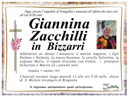 Sabato 9 settembre, presso l’ospedale di Senigallia è mancata all’affetto dei suoi cari all’età di 88 anni Giannina Zacchilli in Bizzarri.