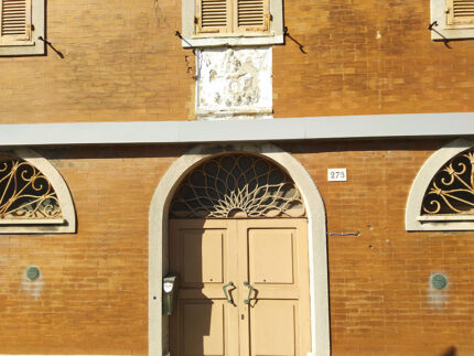 L’architrave si sovrappone parzialmente alla parte superiore della lunetta semicircolare del portone e delle finestre anch’esse semicircolari al piano terra dell’edificio. Al di sopra dell’architrave, sotto la finestra centrale del piano superiore, fu posta una formella che raffigura la traslazione della Santa Casa di Loreto trasportata a volo dagli angeli. Si riproduce l’immagine più dettagliata gentilmente concessa dalla prof.ssa Marina Mancini, in cui ai lati della figura della Madonna con il bambino in braccio si leggeva la seguente iscrizione: