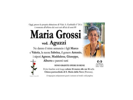 Oggi, presso la propria abitazione di Viale A. Garibaldi n° 24/a è mancata all’affetto dei suoi cari all’età di anni 89 Maria Grossi ved. Aguzzi.