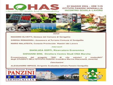 Mercoledì 22 Maggio presso l’Istituto Panzini di Senigallia alle ore 11:15, si terrà l’incontro “LOHAS, Lifestyles of Health and Sustainability – Stili di vita Salutari e Sostenibili”, organizzato dall’Istituto Panzini e dalla Federazione Maestri del Lavoro d’Italia, Consolato Provinciale di Ancona, nell’ambito delle attività scuola-lavoro promosse dai Maestri del Lavoro.