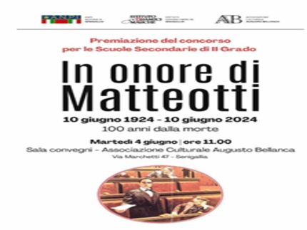 Il circolo Gramsci Carlo Mengucci di Senigallia dell’Istituto Gramsci, la sezione ANPI Giulia Giuliani e Luigi Olivi insieme all’associazione Augusto Bellanca con il patrocinio del Comune di Senigallia, hanno promosso il bando del concorso “In onore di Giacomo Matteotti“ in occasione del centenario dalla sua uccisione, per diffondere tra le giovani generazioni la conoscenza di un uomo che ha difeso la democrazia italiana in un momento storico di estrema gravità ed ha onorato il ruolo politico a cui gli elettori lo avevano destinato, pagando un prezzo altissimo: la vita.