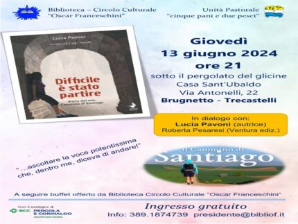 Il successivo Giovedì 13 giugno sempre alle ore 21 avremo la presentazione del libro “Difficile è stato partire” (Ventura edizioni) diario del Cammino di Santiago di Lucia Pavoni. Lucia si è messa in gioco con una esperienza talmente forte e segnante da farne un libro che prova a trasmetterci le emozioni, le gioie e le fatiche di un itinerario che non ha eguali dal punto di vista umano e spirituale. Sarà occasione di confronto con chi ha già fatto il Cammino, o chi ha bisogno di un incoraggiamento a partire, o chi per tanti motivi non può.