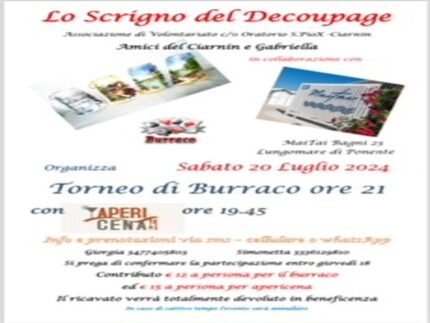 Sabato si svolgerà presso i bagni 23 MAI TAI di Senigallia lungomare di Ponente il torneo di burraco di beneficenza organizzato dallo Scrigno del Decoupage.