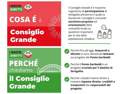 Per questo motivo, abbiamo depositato domenica 5 gennaio, come PD, AVS, Vivi e Vola Senigallia, la richiesta di un Consiglio Grande, il massimo organismo di partecipazione di Senigallia attraverso il quale la Giunta ed i consiglieri comunali possono ascoltare proposte ed orientamenti della comunità locale su questioni importanti per la vita della popolazione cittadina.