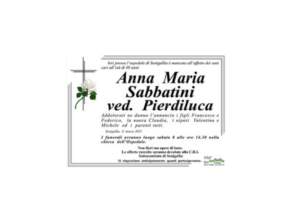 Ieri presso l’ospedale di Senigallia è mancata all’affetto dei suoi cari all’età di 88 anni Anna Maria Sabbatini ved. Pierdiluca.
