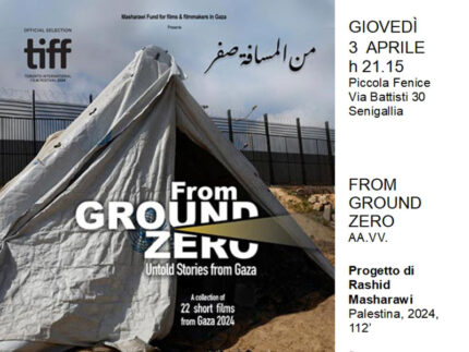 L’associazione Confluenze, in collaborazione con Nazra festival, Scuola di Pace, GSA, Rete per la Pace subito, ANPI, organizza per Giovedì 3 aprile 2025  alle 21.15, alla Piccola fenice in Via Battisti 30 a Senigallia la proiezione di FROM GROUND ZERO di AA.VV., progetto di Rashid Masharawi, Palestina, 2024, 112’.