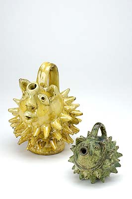 La ceramica di Seminara nasce sia come produzione utile, proponendo oggetti per uso domestico, sia come produzione apotropaica cioè pensata e realizzata per respingere gli influssi magici degli spiriti maligni.L’analisi degli artefatti ceramici di questo centro situato in Calabria, alle falde del parco dell’Aspromonte, così come ci sono giunti nell’arco degli ultimi cento anni, ce lo dimostra palesemente.Oggi non siamo in grado di risalire alle più remote origini della ceramica di Seminara. Possiamo fare riferimento solo a periodi storici più vicini a noi, non oltre il secolo XIX, ad esempio, poiché non disponiamo di reperti che risalgano all’antichità, come hanno sempre segnalato gli storici locali della ceramica e i collezionisti che ben conoscono questo centro figulino calabrese.. Gli stessi elementi stilistici riconducono la ceramica di Seminara alle produzioni siciliana e pugliese, poi a quella greca e turca. In seguito caratteri formali simili si possono rinvenire nella cultura fittile siriana e giordana e in quella di altre aree nord africane. In tutto il bacino mediterraneo, infatti, l’arte ceramica presenta aspetti analoghi, ma questo dato convive con altre peculiarità anche dichiaratamente indigene e fortemente originali. Franco Bucci sosteneva che la ceramica d’uso fosse in realtà simile in tutto il mondo, come la tessitura artigianale, e che non c’era più niente da inventare. Ma noi crediamo che le differenze esistano sempre nonostante le similitudini. Per quanto riguarda la ceramica mediterranea, almeno quella che viene realizzata in epoca storica facendo uso del tornio, gli elementi autoctoni sono distinti e forti. La ceramica dell’Egitto è molto diversa da quella pugliese di Grottaglie e la ceramica contadina della Croazia si differenzia da quella dell’isola di Jerba, nonostante che questi due paesi pratichino ancora entrambi la forgiatura “a colombino”.Seminara si distingue dagli altri centri ceramici mediterranei per non pochi elementi caratteristici: per l’argilla rossa che veniva reperita sul luogo, proprio per realizzare la maiolica a differenza di quella che serviva per forgiare i contenitori d’acqua, più chiara e porosa; per le forme, le dimensioni, le pratiche d’uso, ma anche per gli spessori, per gli smalti e soprattutto per la sua valenza magica nata per contrastare il “malocchio”. Spesso, come si può vedere nella mostra di Fiorenzuola, i due aspetti utili si fondono in un unico oggetto per cui una brocca serve per conservare l’acqua ma anche per allontanare dal suo proprietario gli attacchi dell’invidia.Il valore apotropaico della ceramica di Seminara si esprime attraverso la modellazione di volti umani, quasi sempre còlti in un atteggiamento torvo e provocatore, che si rivolgono al pubblico attraverso una smorfia o l’accentuazione caricaturale di alcune parti anatomiche: la lingua pendente, il naso storto, le narici larghe, gli occhi sporgenti e strabici, le sopracciglia folte, le orecchie a sventola, i capelli arruffati, le corna seminascoste ma onnipresenti.L’aspetto caricaturale della ceramica apotropaica influisce anche sulle forme e le decorazioni della ceramica d’uso sia contemporanea che più antica. I vasi da fiori sono a forma di pigna, di chiara origine cinquecentesca, le “truffe” sono brocche dal doppio fondo nate per prendersi gioco dell’ospite sprovveduto che non sa come versare correttamente l’acqua dal becco principale. Interessanti due tipologie di brocche: a forma di porcospino e nuziali, a ciambella, decorate con fiori. Queste ultime recano anche la doppia uscita per l’acqua ed oggi vengono usate come cornici per le foto di famiglia. I candelieri sono esagerati nelle proporzioni, le alzatine per la frutta sono decorate con trecce sinuose lungo la circonferenza.I vasi per lo strutto riportano strane decorazioni sulla pancia, come se fossero la traduzione grafica di un nome magico. Le pentole hanno per manici orecchie umane, gli orci colano lo smalto sul loro ventre, le ciotole piangono il verde del rame sull’ingobbio vetrificato.È la proposta, dunque, di un universo vitale e chiassoso, di un mondo estroverso e colorato fatto di oggetti creati da un apprendista stregone, che restano in attesa del calare della notte per animarsi e schiamazzare nelle madie e nelle mensole delle cucine dei contadini calabresi.