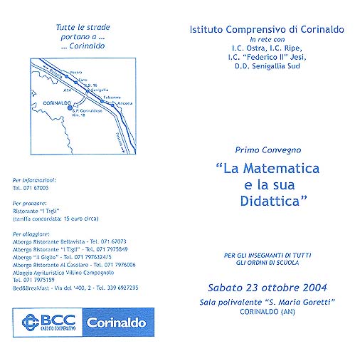 Il 23 ottobre, presso la sala polivalente "S.M. Goretti" di Corinaldo, si svolgerà il primo convegno "La Matematica e la sua Didattica", organizzato dall’Istituto Comprensivo di Corinaldo, in rete con l’I.C. di Ostra, l’I.C. di Ripe, l’I.C. "Federico II" di Jesi e la D.D. di Senigallia Sud.