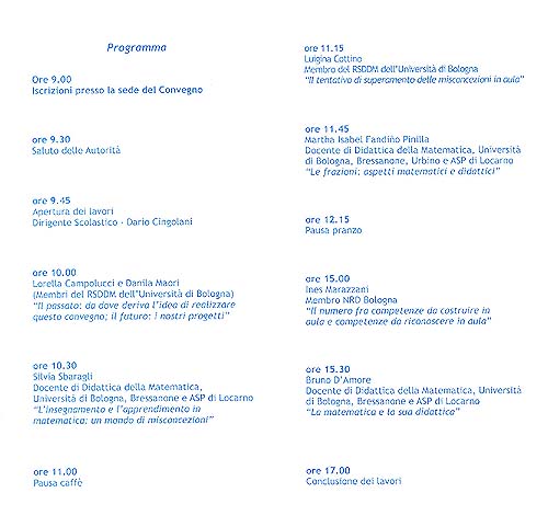 Il tema del convegno è dei più attuali. Sappiamo che la vera professionalità degli insegnanti si gioca tutta sulla didattica, anzi sulle didattiche delle varie discipline e ormai moltissimi insegnanti e dirigenti sono convinti che non è sufficiente accumulare anni e anni di esperienza, ma è necessario studiare e confrontarsi.Il convegno, si presenta, allora, come una stimolante occasione di formazione e di confronto con i maggiori esperti della didattica della matematica.Il programma, che si articola per tutta la giornata di sabato 23 ottobre, prevede, dopo il saluto delle autorità, l’intervento del dirigente scolastico, prof. Dario Cingolani, per l’avvio dei lavori, quindi un intervento delle docenti Lorella Campolucci e Danila Maori, membri del gruppo RSDDM di Bologna e del gruppo di lavoro dell’istituto di Corinaldo. Seguono le relazioni delle insegnanti Luigina Cottino e Ines Marazzani, membri del gruppo RSDDM di Bologna, delle prof.sse Silvia Sbaragli e Martha Isabel, Fandino Pinilla, docenti dell’Università di Bologna, Bressanone e Locarno e autrici di numerose pubblicazioni sulla didattica della matematica, infine, del prof. Bruno D’Amore, anche lui docente dell’università di Bologna, Bressanone e Locarno, autore di numerosissimi testi e pubblicazioni sulla didattica della matematica e responsabile scientifico del gruppo di Ricerca di Bologna.