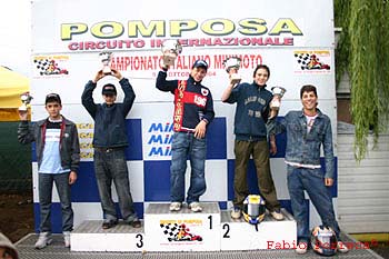 Si è svolta a Pomposa (FE), la quarta ed ultima gara valida per le finali del campionati italiano di minimoto.Il sabato le prove sono andate bene per tutti, a parte qualche scivolone.Domenica mattina, prove cronometrate su pista bagnata e sotto la pioggia. Alcuni piloti hanno disertato questa seconda prova cronometrata ufficiale, per via del brutto tempo.Nella categoria senior A , "Billo" Giuliano Gregorini, si è aggiudicato la pole position. "Lady" Valentina Caltavituro, con sorpresa di tutti, per quasi tutta la prova si era aggiudicata il secondo posto, solo all’ultimo, quasi superando il limite, Fanelli Davide, è riuscito a migliorare il suo tempo di qualche decimo per superare Lady all’ultimo. Si sono chiuse così le prove cronometrate ufficiali, con Billo al primo posto, Fanelli Davide al secondo posto e la nostra Lady Valentina con sorpresa di tutti al terzo posto; gli altri a seguire.La gara si è svolta con enorme vantaggio di Billo sugli altri. Lady Valentina faceva un sorpasso dopo l’altro. Lei paura non ne aveva a differenza di altri piloti anche molto più dotati di lei.Purtroppo la caduta di Ravaioli, altro pilota ha causato la caduta anche di Lady Valentina, alla quale si è anche ingolfata la moto. Risolto il problema, Lady ha fatto la sua rimonta, ed è arrivata al 9 posto. Se non fosse caduta a causa dell’altro pilota che le è caduto proprio davanti, chissà a che posto arrivava.La differenza di tempi per Lady, tra bagnato e asciutto praticamente non esisteva, a differenza di altri, che hanno abbassato il loro tempo migliore notevolmente.Billo è arrivato primo.Campione italiano per quest’anno è Andrea Forlani, che durante quest’ultima finale ha rotto il motore.Resta da fare l’ultima gara del campionato costruttori a Forlimpopoli per concludere l’anno agonistico delle minimoto ufficiale, che sarà domenica 24 ottobre, sul circuito di Galliano Park.