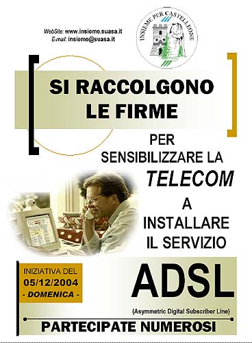 Il Movimento Socio-politrico-culturale "Insieme per Castelleone", per sensibilizzare la TELECOM ad istallare l’ADSL sulle reti telefoniche castelleonesi e dei paesi delle valli Misa-Nevola e Valcesano ha organizzato una raccolta di firme in piazza Vittorio Emanuele II, che sarà effettuata tra la popolazione di Castelleone di Suasa, domenica 5 dicembre 2004, dalle ore 9,00 alle ore 18,00.Successivamente, le firme raccolte, saranno presentate al Sindaco, con un allegato Ordine del Giorno da presentare in Consiglio Comunale dal titolo: SERVIZIO ADSL NELLE VALLI MISA-NEVOLA E VALCESANO, con la richiesta di unanime approvazione, indipendentemente dall’appartenenza partitica di ciascuno, e di prendere una posizione forte per far si che la TELECOM acceleri le procedure d’intervento sulla Rete in modo da poter disporre del servizio ADSL anche nelle nostre comunità.Tutti ormai sanno l’importanza dell’ADSL che permette la navigazione in Internet 10 volte superiore a linee ISDN e 50 volte superiore a modem 56K.In altri termini si può navigare e contemporaneamente parlare al telefono, senza per questo dover installare una nuova linea telefonica (come per ISDN).Purtroppo, i Comuni di Castelleone di Suasa, Barbara, Ostra Vetere, Corinaldo, Ripe, Castelcolonna e Monterado in provincia di Ancona e per i Comuni di San Lorenzo, Fratte Rosa, Mondavio, Orciano, Monteporzio, in provincia di Pesaro e Urbino, non sono stati ancora raggiunti dal servizio e la stessa Telecom, interpellata in tal senso, ha dichiarato di non sapere quando ciò sarà possibile.E’ per questo motivo che si richiede all’Amministrazione di inviare l’O.d.G. anche a quei Consigli Comunali, affinché se lo facciano proprio e lo inviino anch’essi alla TELECOM. L’O.d.G., nella parte finale, chiede alla TELECOM, di tenere presente le esigenze dei cittadini e delle aziende residenti nelle due vallate del Misa-Nevola e Cesano e di predisporre, quanto prima, i lavori necessari sulla Rete per fornire il servizio di ADSL a tutti, in modo da favorire lo sviluppo anche delle nostre comunità.
