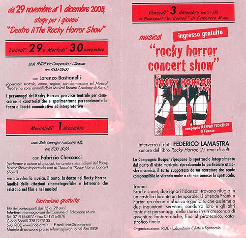 Brad e Janet, due ignari fidanzatini trovano rifugio in un castello durante un temporale. Li attende Frank’n’Furter, un alieno diabolico e geniale, che assieme a due inquietanti servitori, condurrà loro e gli altri fantastici personaggi della storia in un crescendo di avventure fanta-erotiche, fino al pirotecnico, catastrofico finale. E’ il ROCKY HORROR SHOW, il cult-musical firmato Richard O’Brien più amato e rappresentato del secolo; il più irriverente, divertente, trasgressivo, travolgente e sensuale della storia del rock. Pieno di spunti tratti dai classici letterari e cinematografici, dell’horror, della fantascienza e dell’erotismo, è stato un enorme successo anche sul grande schermo, diretto da Jim Sharman nel 1975 e con un cast che comprendeva Tim Curry, Susan Sarandon e Meat Loaf. Ed è con lo scopo di metterlo in scena che si è formata nel 1997 KASPAR HAUSER, una compagnia di cantanti e musicisti dell’area fiorentina accomunati dalla medesima passione per il musical, tutti appartenenti a gruppi musicali o a compagini vocali già note ed operanti in zona. Insieme al Rocky Horror Show (le cui repliche vanno avanti oramai da oltre cinque anni) la compagnia ha all’attivo anche il musical originale A DAY IN THE LIFE, una storia fuori orario ispirata ai personaggi delle canzoni dei Beatles.